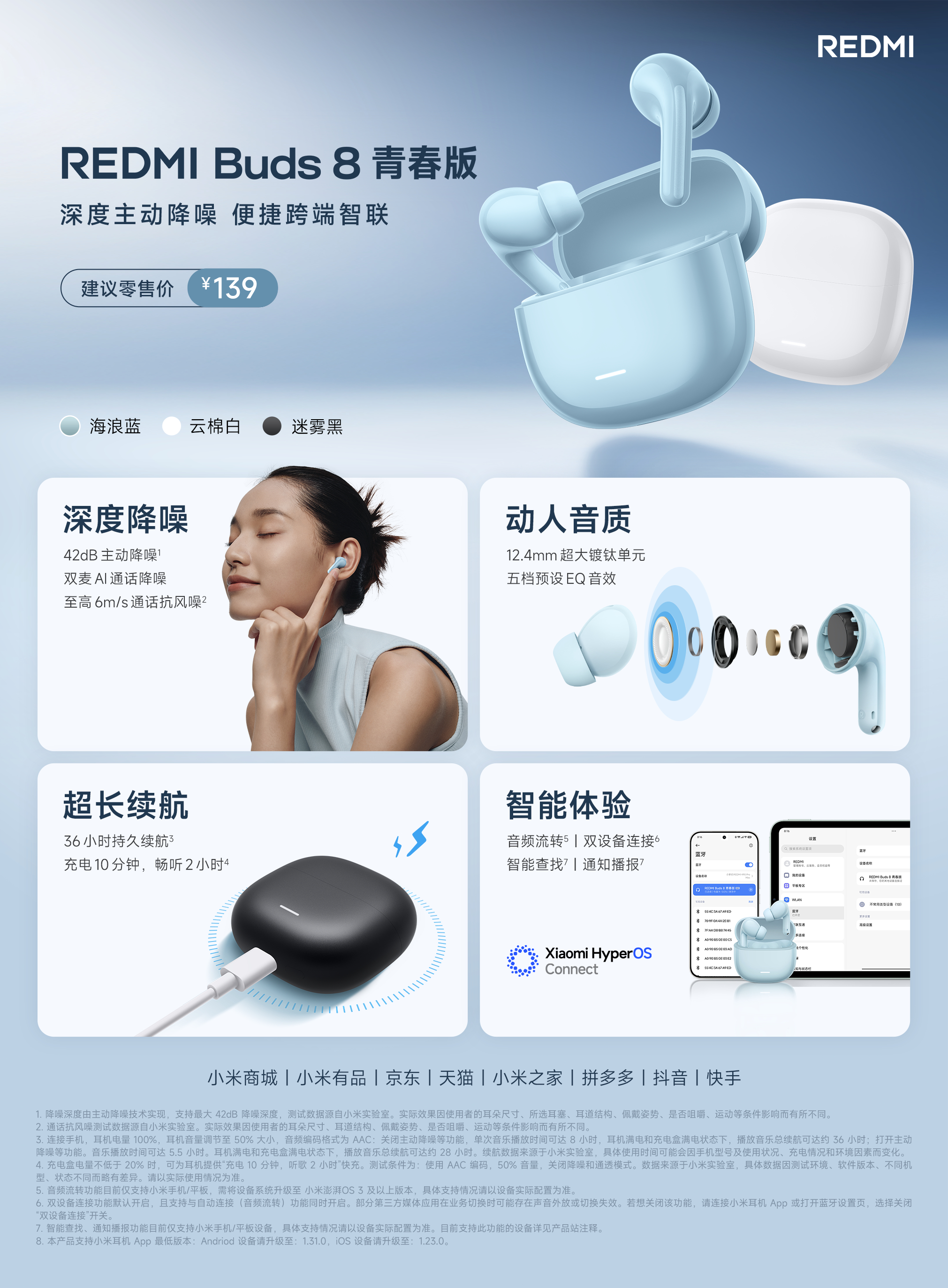 大阳2月26日,REDMI Buds8青春版已上线,售价139元,支持42db主动降噪、双麦AI通话降噪以及至高6m/s通话抗风噪。