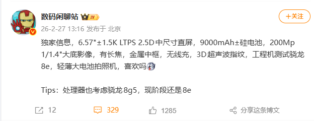 飞鱼2月27日,知名博主数码闲聊站爆料了某厂新机部分参数,具体如下。