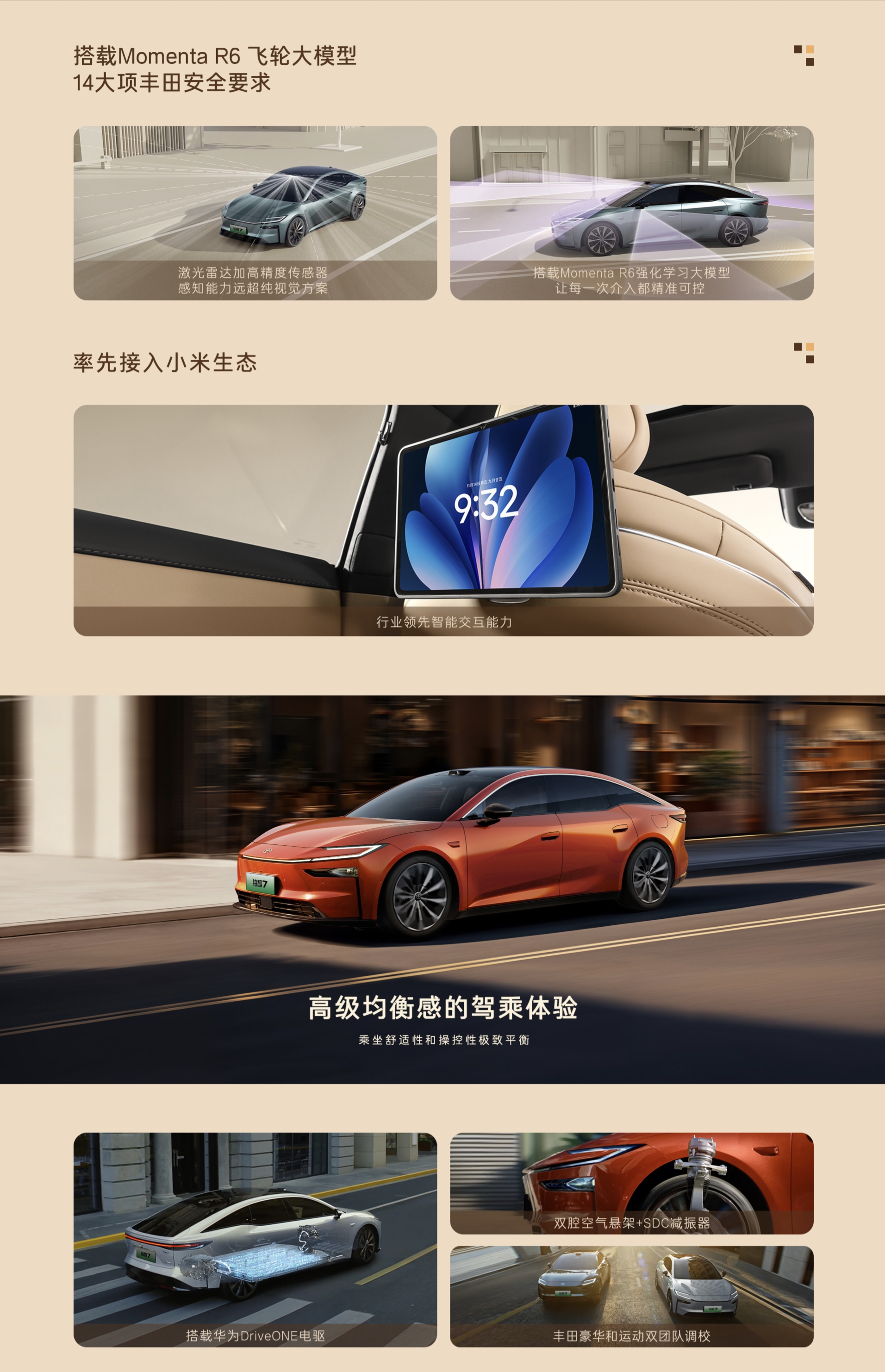 动力方面,搭载华为DriveONE电驱,后驱版最大功率282马力,配88.1kWh磷酸铁锂电池,CLTC续航710km。底盘由丰田GR与雷克萨斯团队联合调校,同时支持鸿蒙、Momenta、小米生态融合。