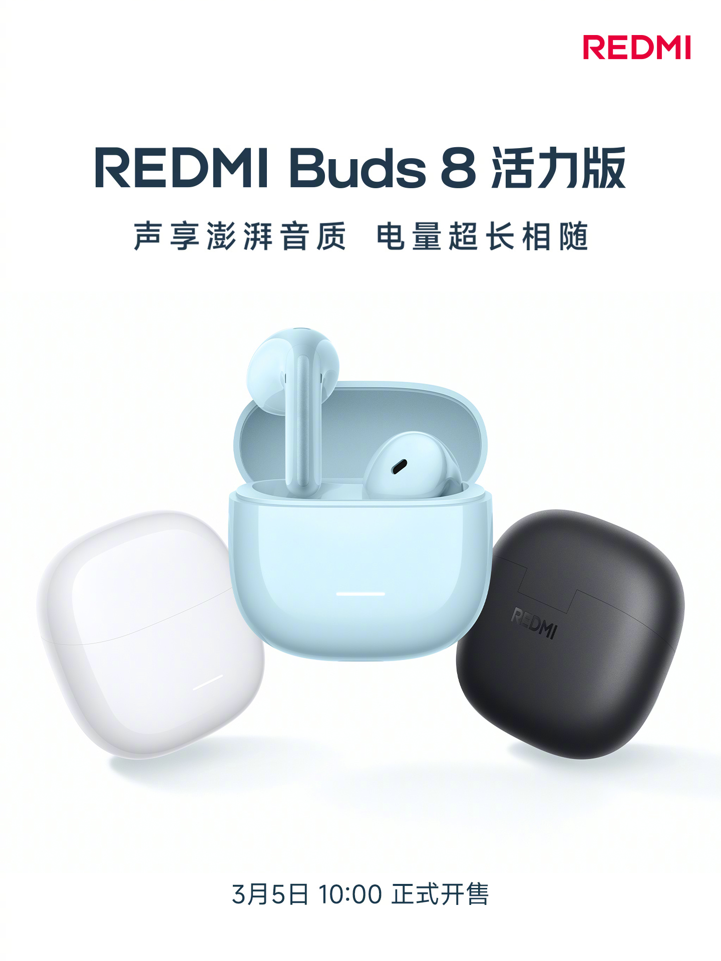 目前REDMI Buds 8活力版已开启预约,并将于3月5日早上10:00正式开售。