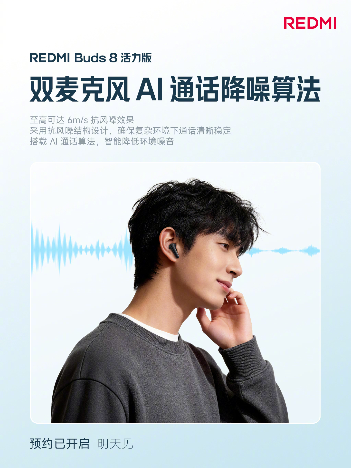 REDMI Buds 8活力版采用了半入耳和抗风噪设计,支持双麦克风AI通话降噪算法,在复杂环境下通话,也能保持清晰的拾音效果。