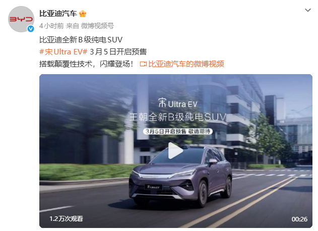 3月4日,比亚迪官宣了王朝首款B级纯电SUV宋Ultra EV将搭载颠覆性技术,并于3月5日开启预售。