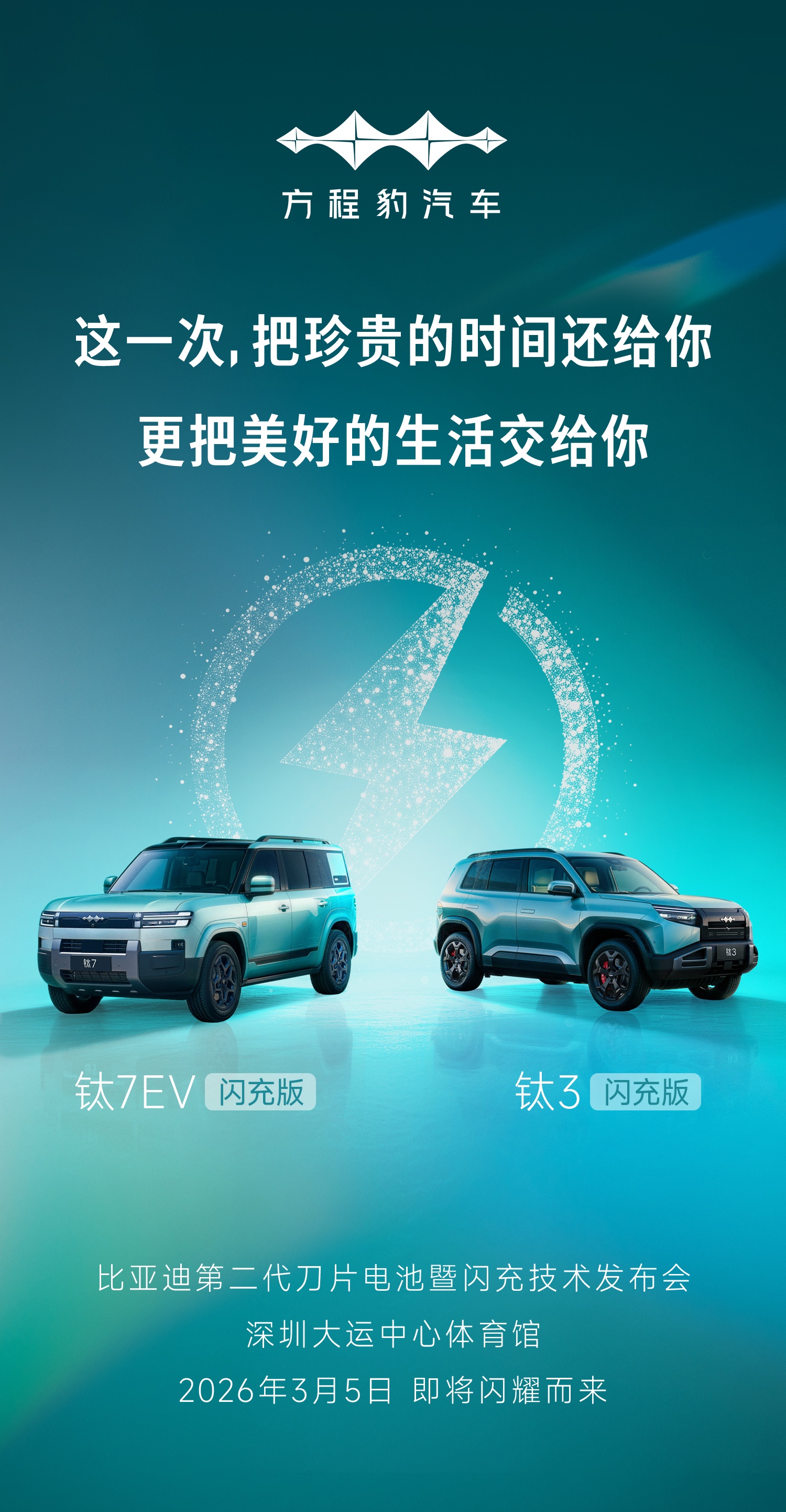 比亚迪于今日官宣,比亚迪第二代刀片电池暨闪充技术发布会将于3月5日19:00在深圳大运中心体育馆举行。随后,比亚迪旗下品牌方程豹汽车也宣布:钛3闪充版和钛7EV闪充版将亮相此次发布会。