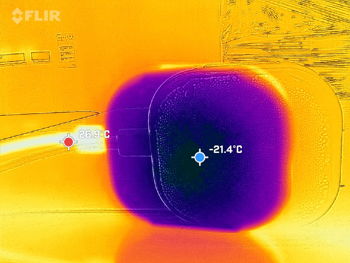 室温约25℃环境下,开启“破坏神模式”空载运行10分钟,制冷面温度-21.4℃,空载制冷能力强劲。
