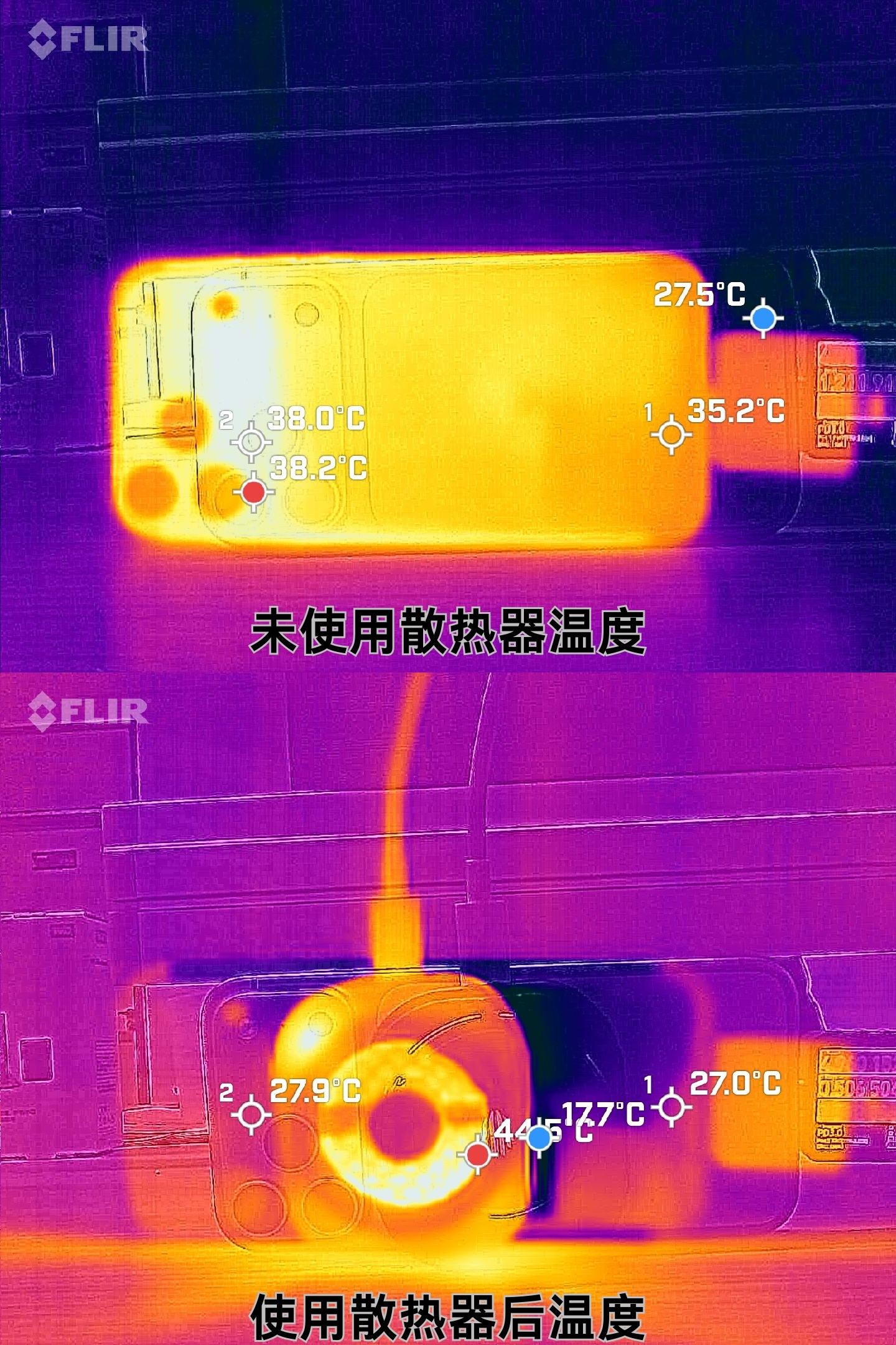 直播场景测试30分钟,使用抖音APP并全程插电。未使用散热器时手机发热明显,最高温度38.2℃;开启智能模式后,机身背部最高温度仅27.9℃,降温超过10℃,效果非常可观。