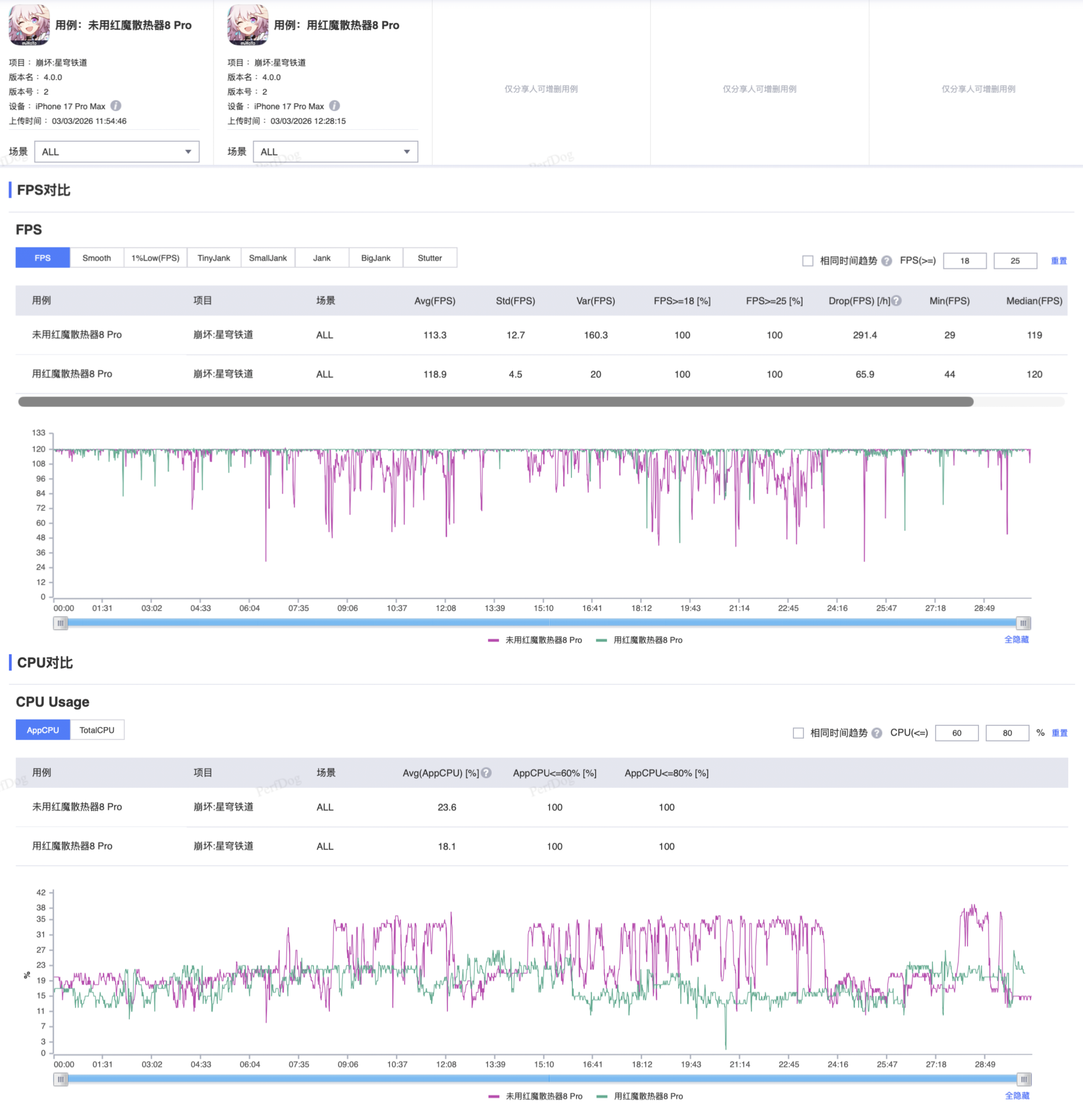 帧率方面,无散热器时平均帧率113.3帧,但游戏过程掉帧、卡顿明显;搭配散热器后,卡顿大幅减少,平均帧率提升至118.9帧。另外,PerfDog监测到的数据显示,散热器能让CPU保持高频运行的时间更长,从而实现更稳定、更极致的性能释放。