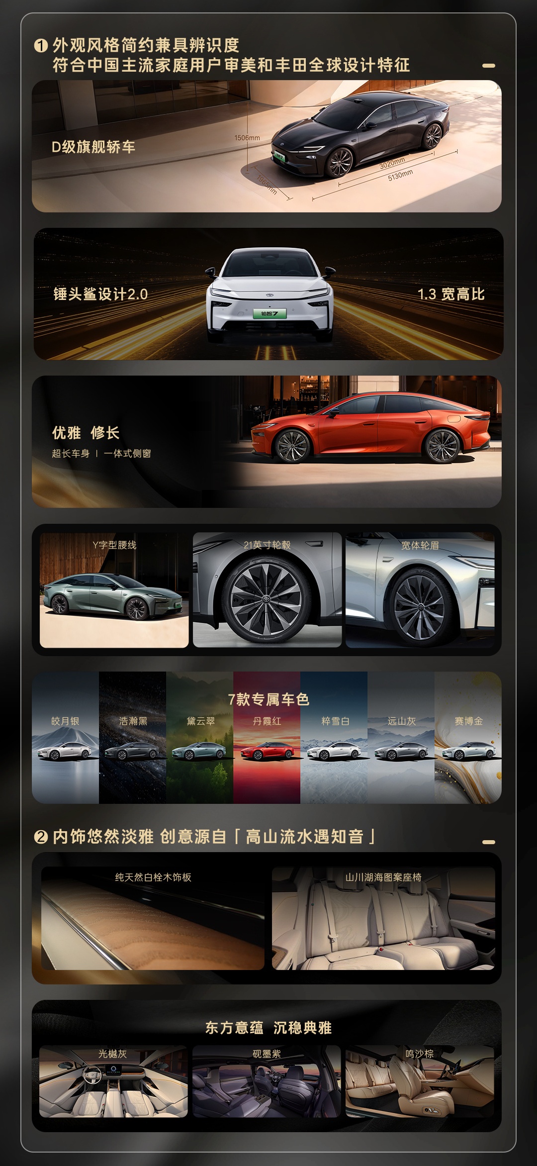 据官方介绍,铂智7定位“D级旗舰轿车”,车身尺寸5130*1965*1506mm,轴距3020mm,采用简约兼具辨识度的外观设计,比如锤头鲨前脸、一体化侧窗、Y字型腰线、宽体轮眉等,以及配备了车顶激光雷达和21英寸轮毂。