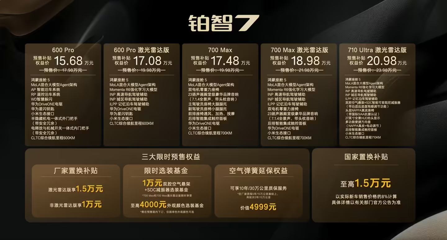 另外,铂智7还采用了全场景智慧座舱解决方案,搭载有鸿蒙座舱5、MoLA混合大模型Agent架构、一碰传技术、华为星闪钥匙、小米车载智能软硬件生态。动力续航上,该车搭载了华为DriveONE电驱,最大功率207kW,匹配88.13kWh磷酸铁锂电池,CLTC综合续航710km。