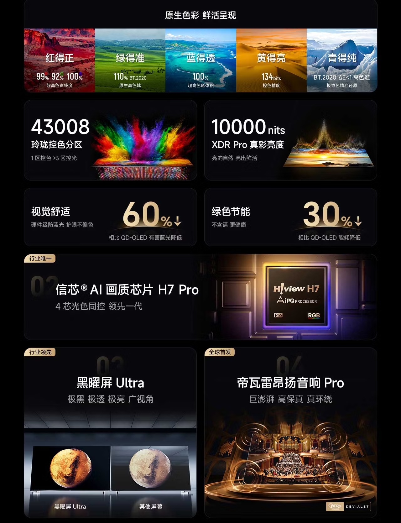 据了解,海信UX 2026款RGB-Mini LED电视首发搭载玲珑真彩背光技术,在RGB三基色基础上增加天青色自发光芯片,构成四色光源系统,可实现110% BT.2020色域覆盖,相比常规显示设备可多呈现约1.2亿种色彩,提升青色系自然场景的还原能力。同时搭载信芯AI画质芯片H7 Pro,支持四芯同控,具备4万级分区的控制能力。产品峰值亮度可达XDR Pro 10000尼特,最高配备43008个控色分区,控色精度为134bits,可降低画面串色与光晕现象。