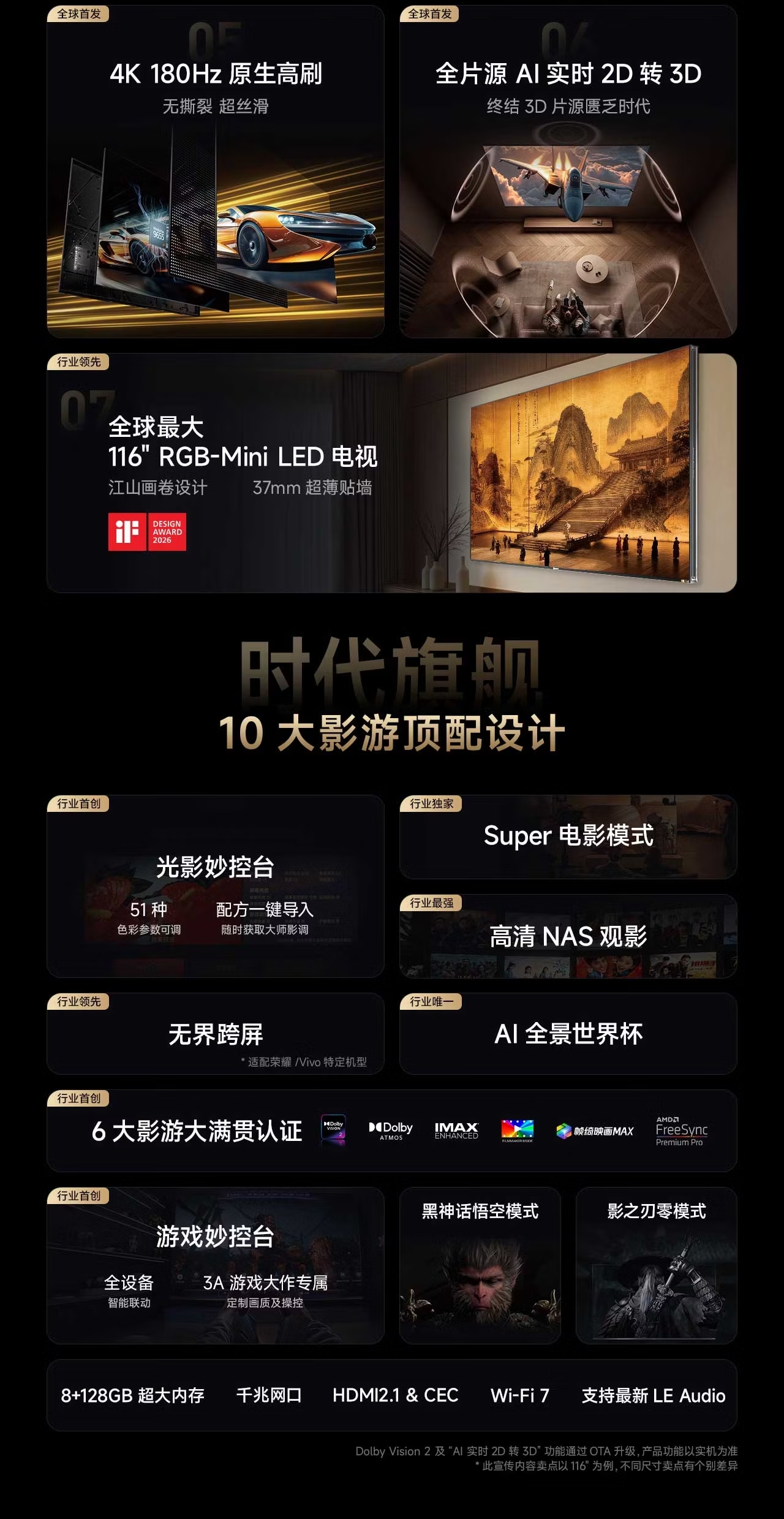 显示与接口方面,该系列支持原生4K分辨率与180Hz刷新率,配备满血版HDMI 2.1接口,搭载帝瓦雷昂扬音响Pro,采用6.2.2物理声道,支持穹顶声场效果。此外,产品还具备AI实时2D转3D功能,可对普通片源进行转换处理。