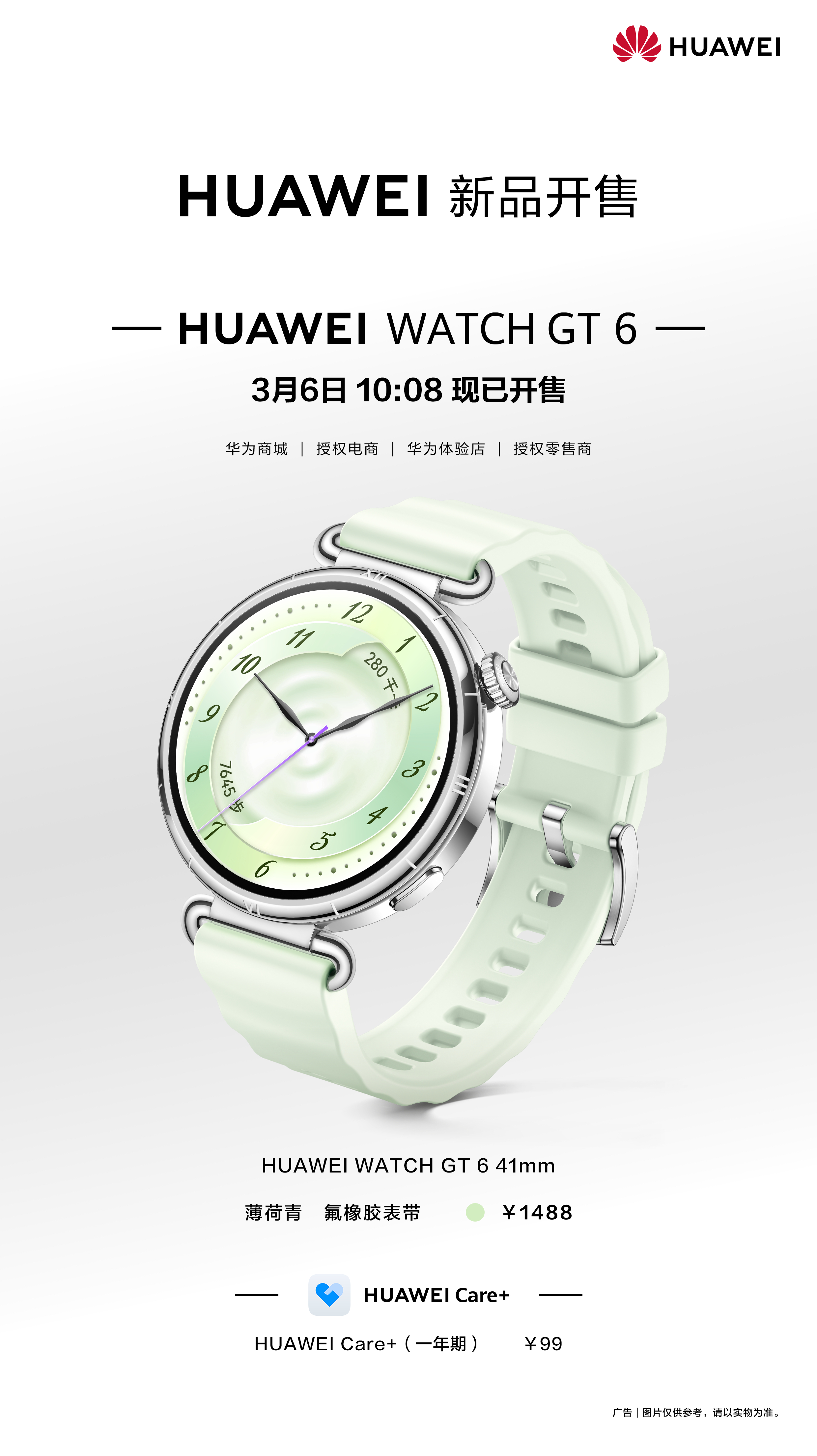 大阳3月6日,华为上新Watch GT6薄荷青配色,现已正式开售,售价1488元。