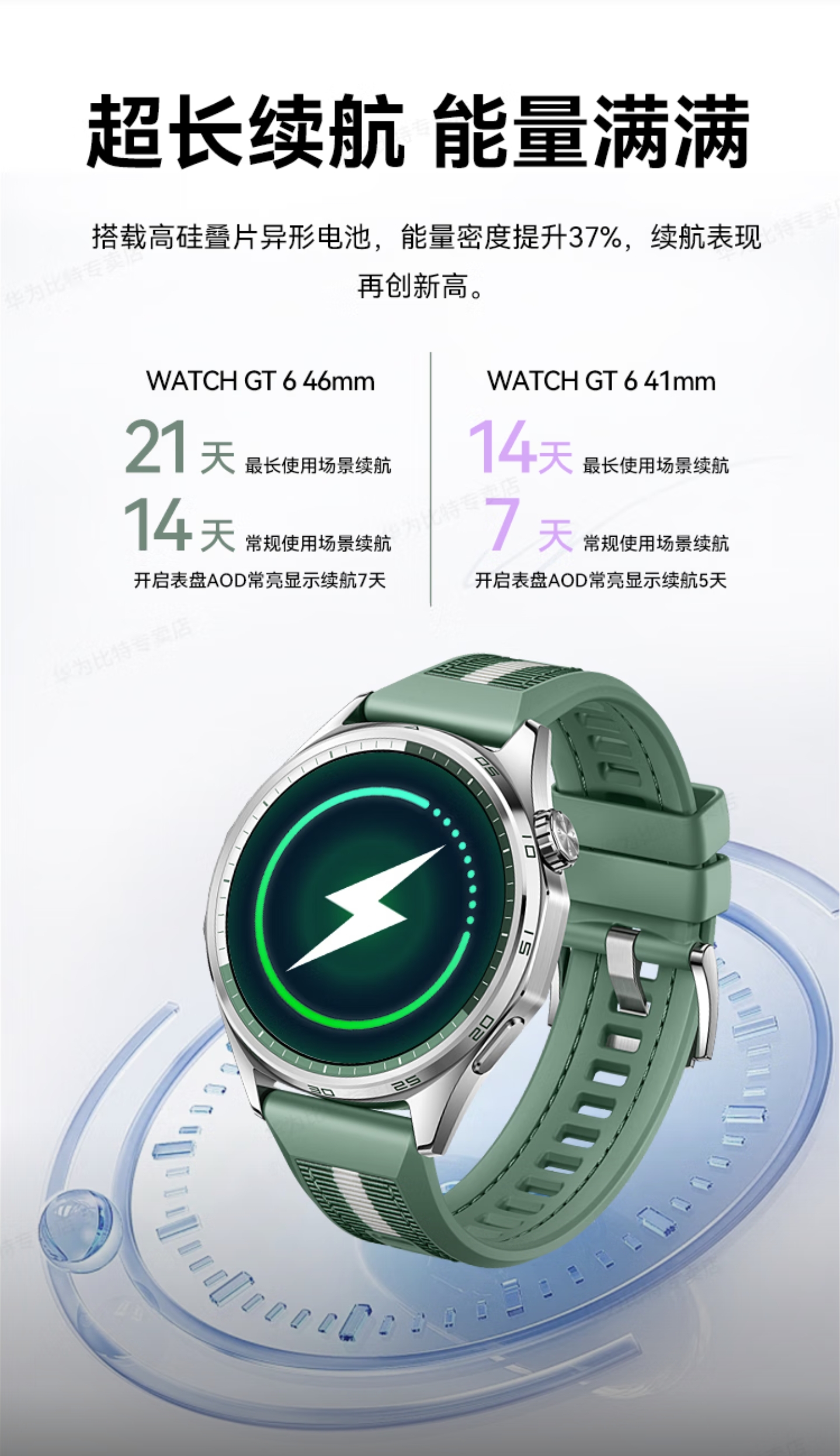 据了解,华为Watch GT6标准版共有41mm和46mm两种尺寸,其中41mm尺寸轻度使用场景续航14天,常规使用场景续航7天;46mm尺寸轻度场景使用续航21天,常规使用场景续航12天,目前薄荷青新配色仅提供41mm版本。