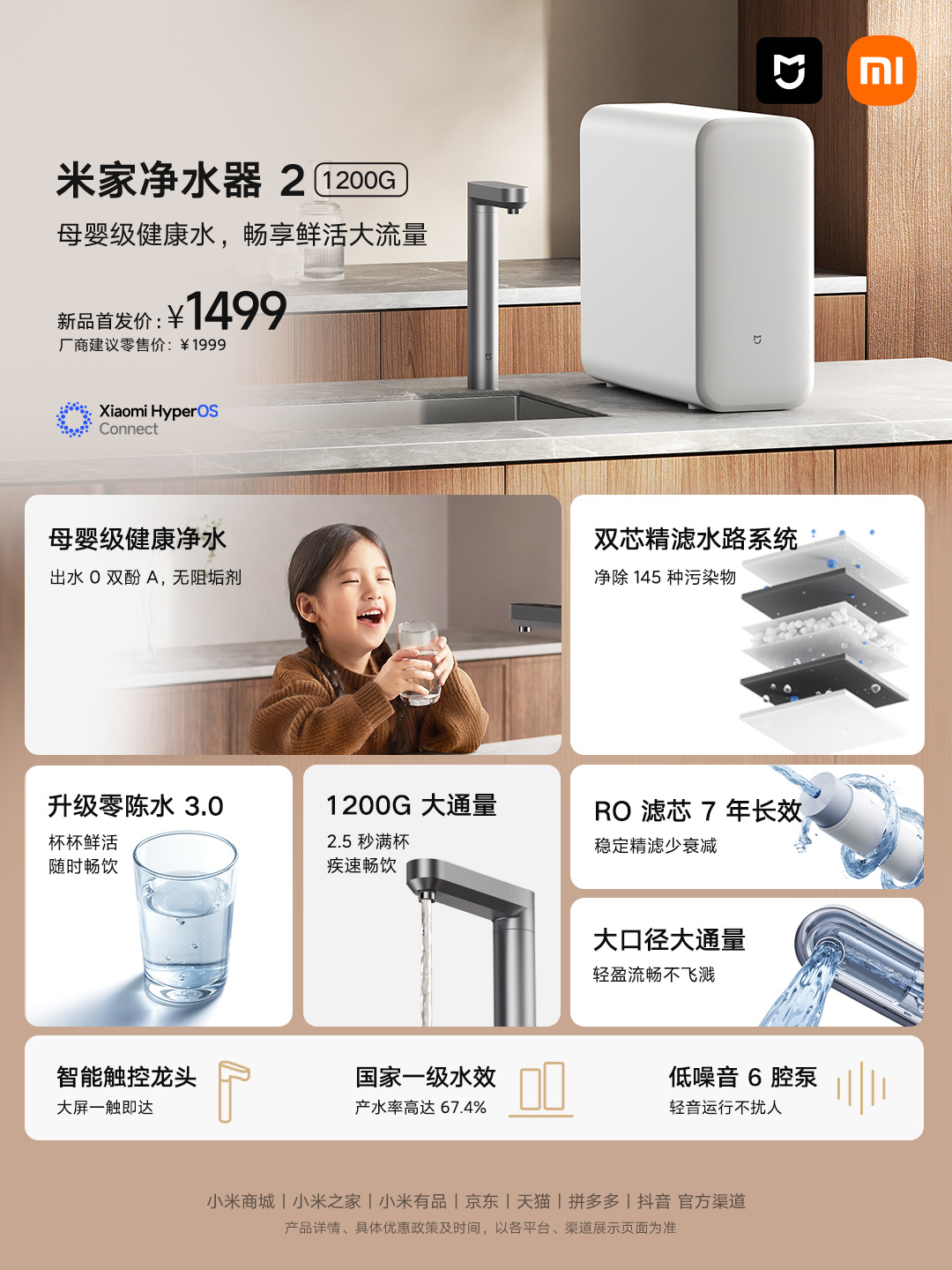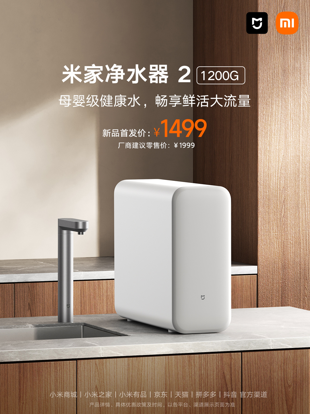 大阳3月6日,小米米家净水器2已全渠道开售,主打母婴级净水、7年长效RO滤芯以及1200G大通量,新品首发价1499元。