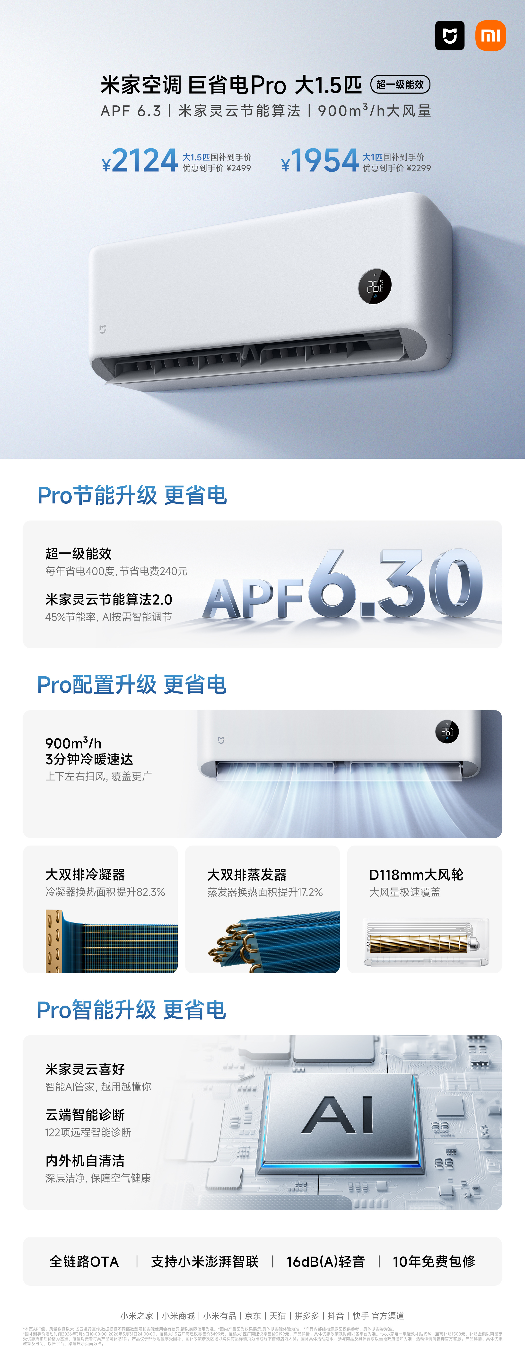 大阳3月6日,小米米家空调巨省电Pro现已开售,大1匹、大1.5匹版本可选,售价2299-2499元,叠国补到手价1954起。