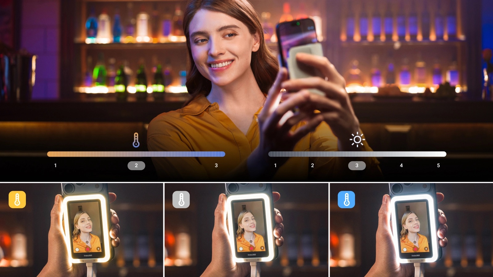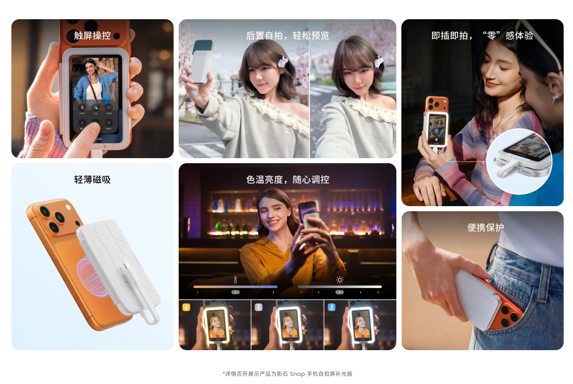 据介绍,Snap手机自拍屏机身轻薄,便于手持自拍,磁吸使用无负担。另外还自带定制收纳套,可避免屏幕刮蹭划伤,安心塞入口袋或者背包。值得提及的是,影石还携手AMIRO觅光联合调校了补光版环形补光灯的色温亮度,支持三种色温和五档亮度调节,能有效柔化面部阴影与泪沟,随手拍出好气色。