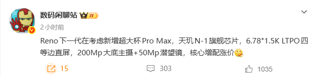 该博主还提到,这款Pro Max版本机型可能会搭载联发科天玑上一代的旗舰芯片;屏幕方面会采用常规的6.78英寸四等边OLED屏幕,分辨率为1.5K,支持可变刷新率;影像上会使用2亿像素主摄+5000万像素潜望长焦组合。