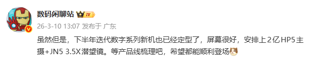 3月10日消息,博主@数码闲聊站透露,在今年下半年,真我手机数字系列将迎来迭代款,或搭载2亿像素三星HP5主摄和3.5倍的三星JN5潜望长焦。