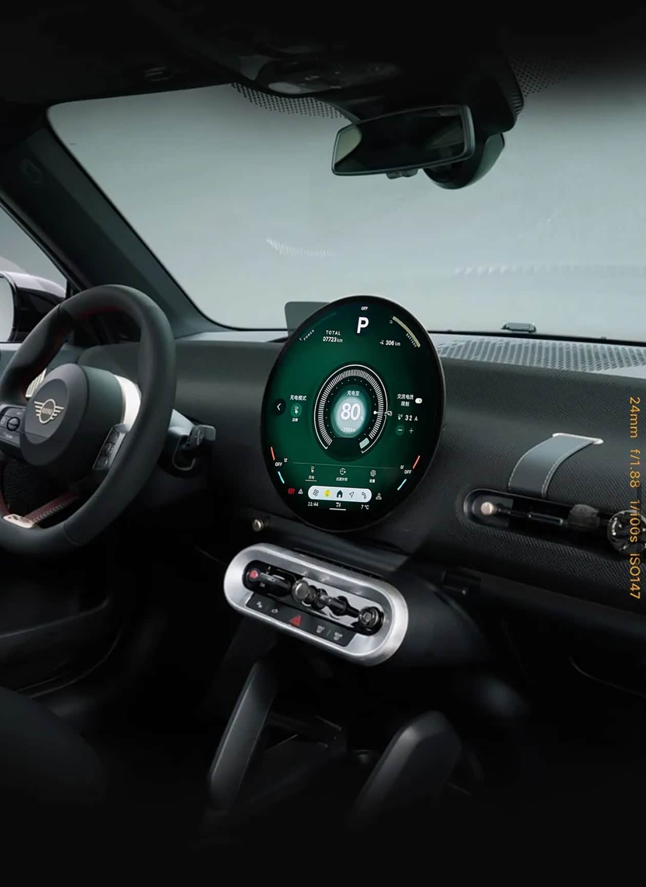 内饰部分,新车继续沿用了电动MINI家族式的设计语言,经典的圆形中控屏幕依旧是内饰的视觉焦点。
