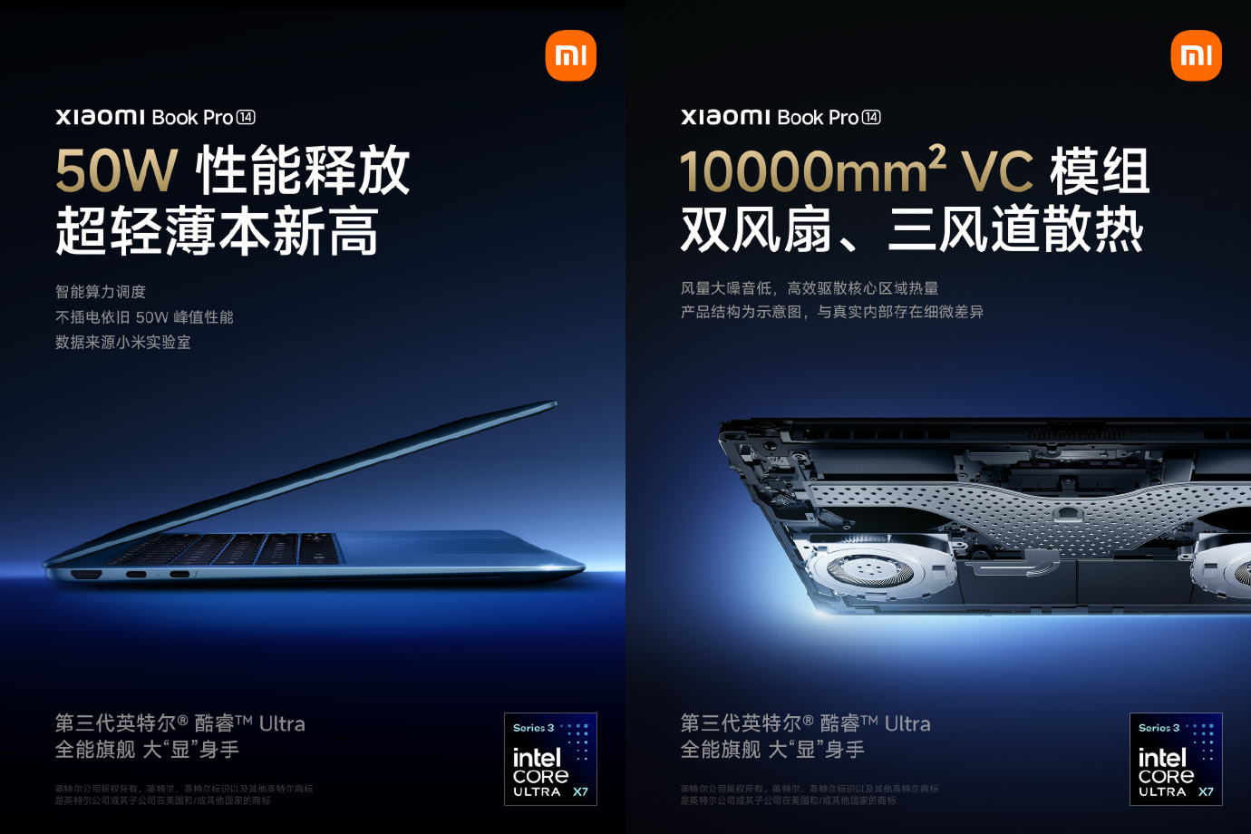 性能方面,它可选的最高配置为第三代英特尔酷睿Ultra X7 358H处理器,配备10000mm² VC散热模组,采用双风扇、三风道散热设计。官方表示,这款笔记本在不外接电源时使用,也能保持50W的峰值性能释放表现。