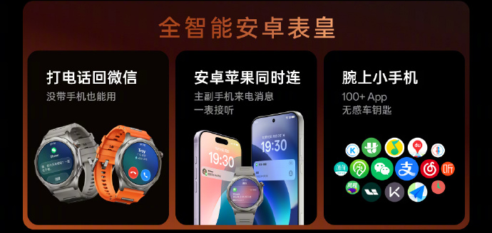软件功能方面,OPPO Watch X3支持安卓、苹果设备同时连接,主副机来电消息也可以在表上接听。此外它还支持独立通话、微信回复功能,还可使用百余个APP。