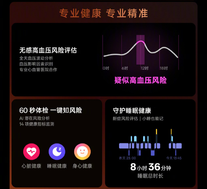 健康监测方面,它升级了无感高血压风险评估功能,并与中国医学院阜外医院联合开展高血压风险评估研究,给用户提供血压、心脏、睡眠、身心健康方面的风险预测。