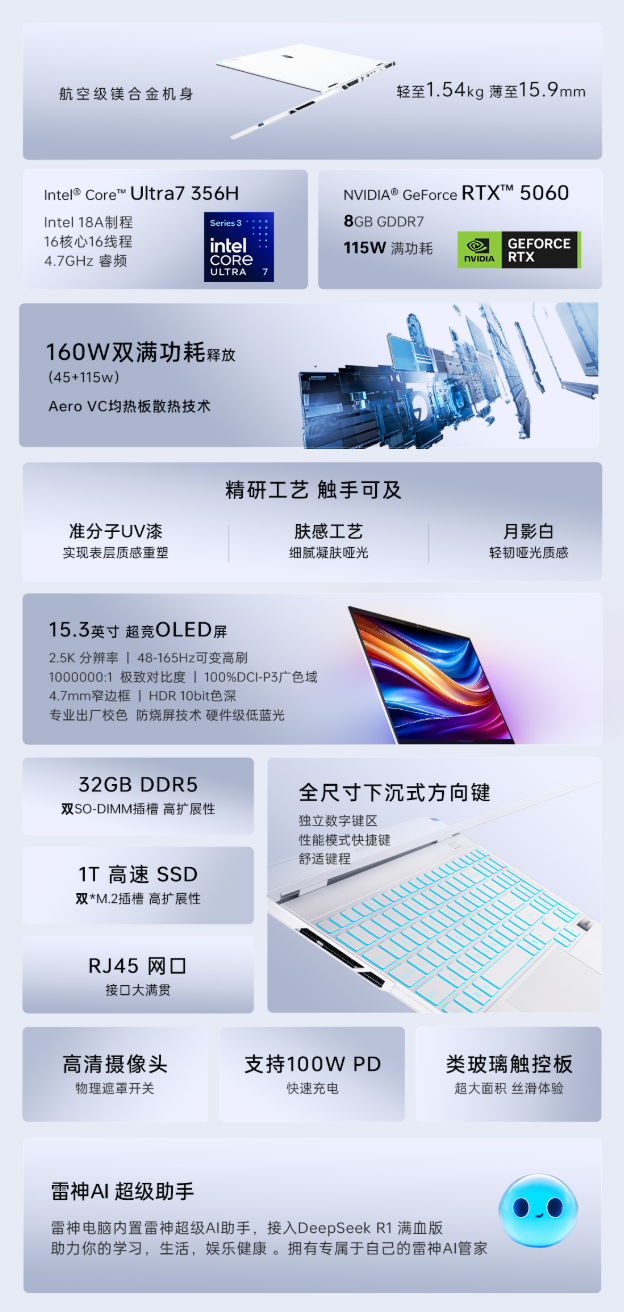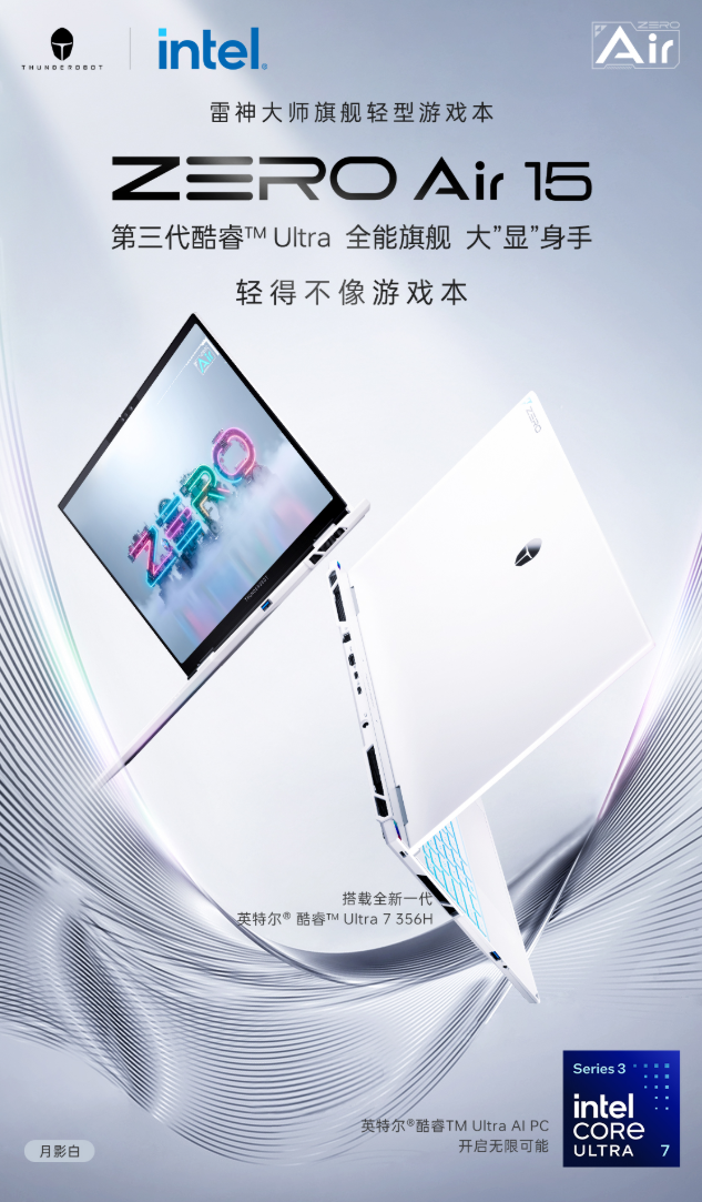 3月12日,雷神已在京东上架ZERO Air15游戏本,Ultra7 356H、Ultra9 386H处理器可选,配备32GB RAM和1TB SSD,目前该笔记本处于预约状态,4月8日10:00抢购开始,预计4月15日正式开售,不过价格尚未公布。
