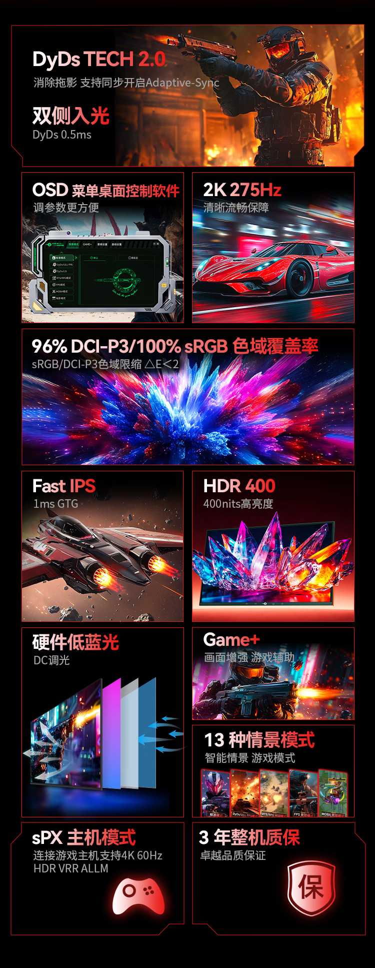 据悉,该显示器搭载一块双侧入光式Fast IPS面板,分辨率2560×1440,刷新率275Hz,SDR亮度350nits,HDR亮度400nits,色域覆盖96%DCI-P3、93%Adobe RGB,色差ΔE<2,GtG响应时间1ms。