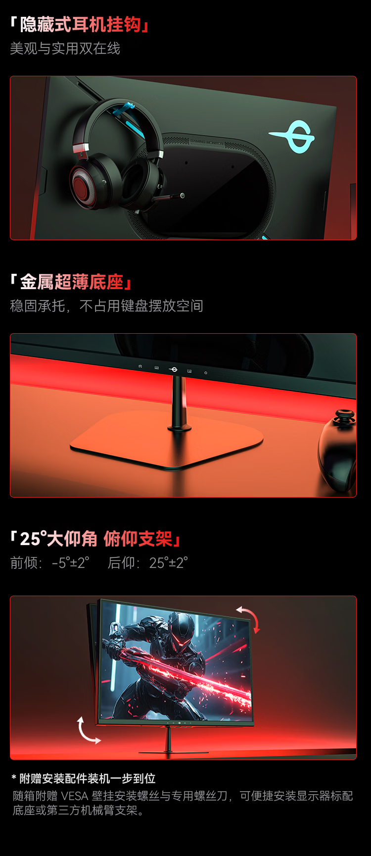 其他方面,该显示器搭载DyDs 2.0技术,支持OSD桌面控制软件,配备金属超薄底座、5向摇杆、隐藏式耳机挂钩、4枚快捷键等配置。