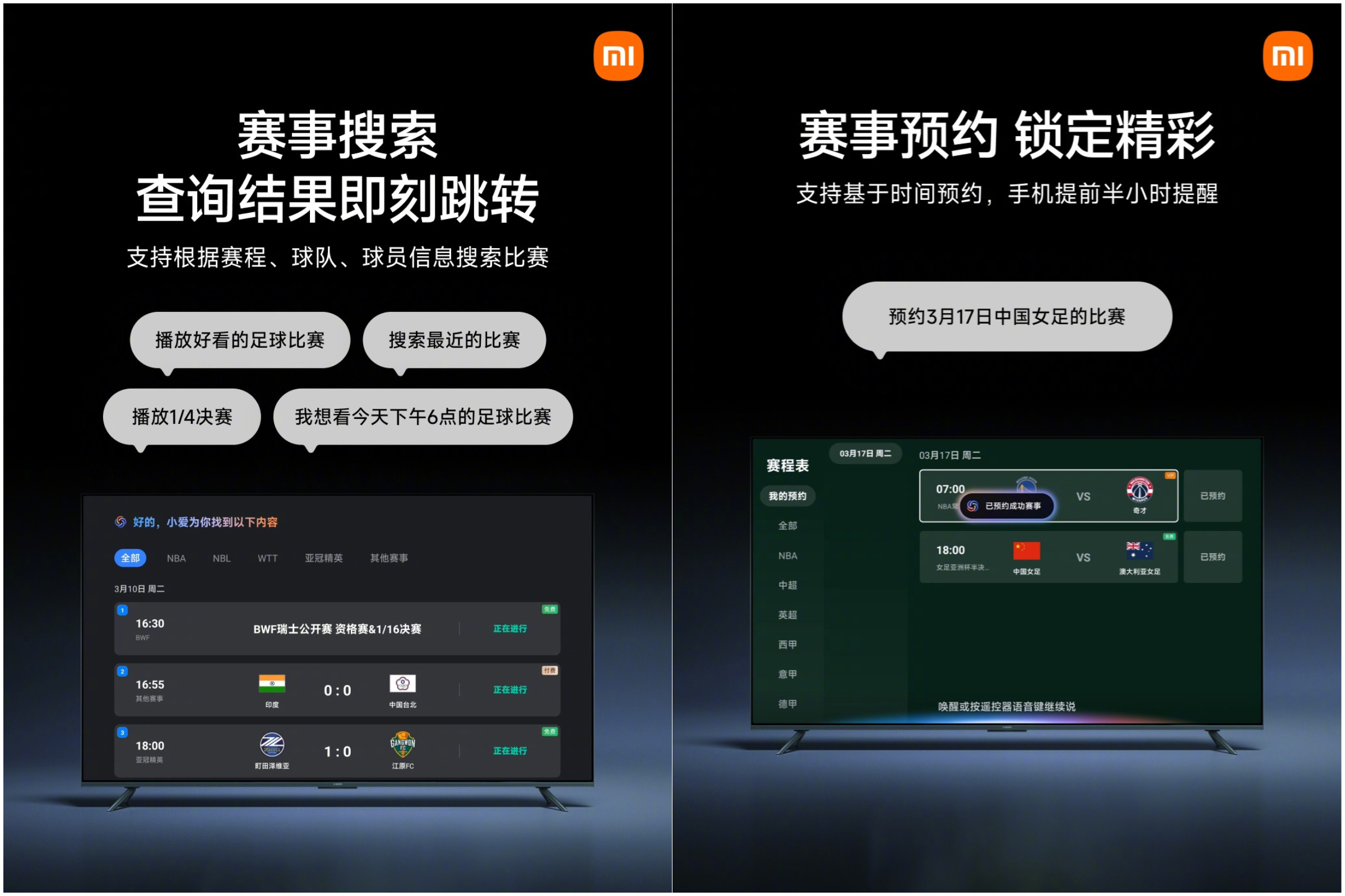 3月17日,小米澎湃OS官方宣布,电视端超级小爱V5.9「体育赛事」功能上线,支持赛事搜索(根据赛程、球队、球员信息搜索比赛)、赛事预约(按时间预约,手机将在赛前半小时提醒)等特性。