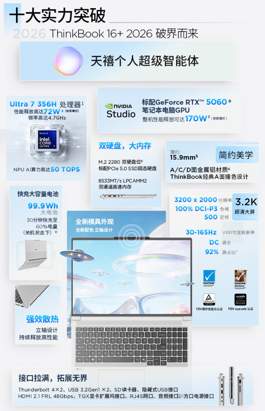 3月19日,联想已上架2026酷睿Ultra版ThinkBook16+,该机共有银白、灰两种配色,搭载酷睿Ultra7 356H+RTX5060显卡,售价11499元。目前该产品在京东平台处于预约状态,将于3月25日发售。