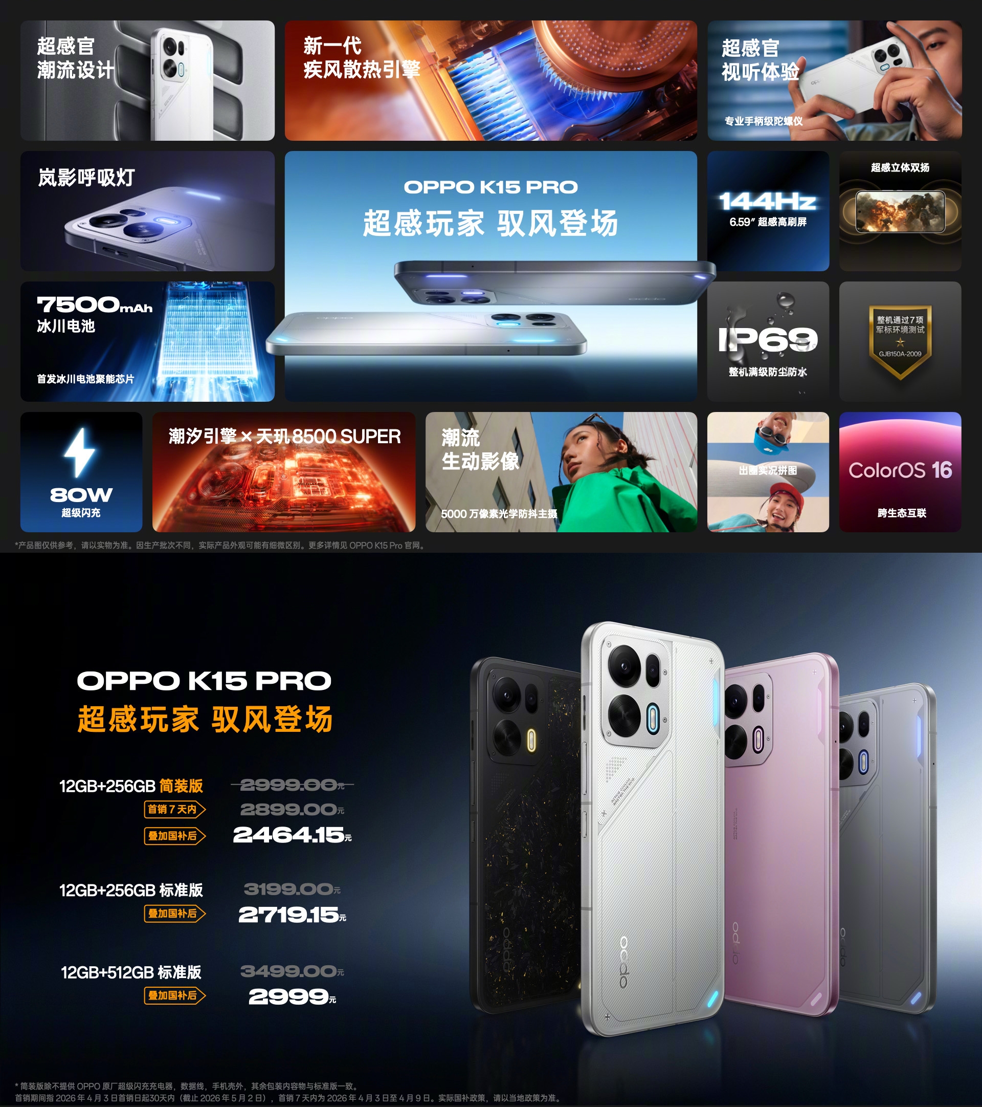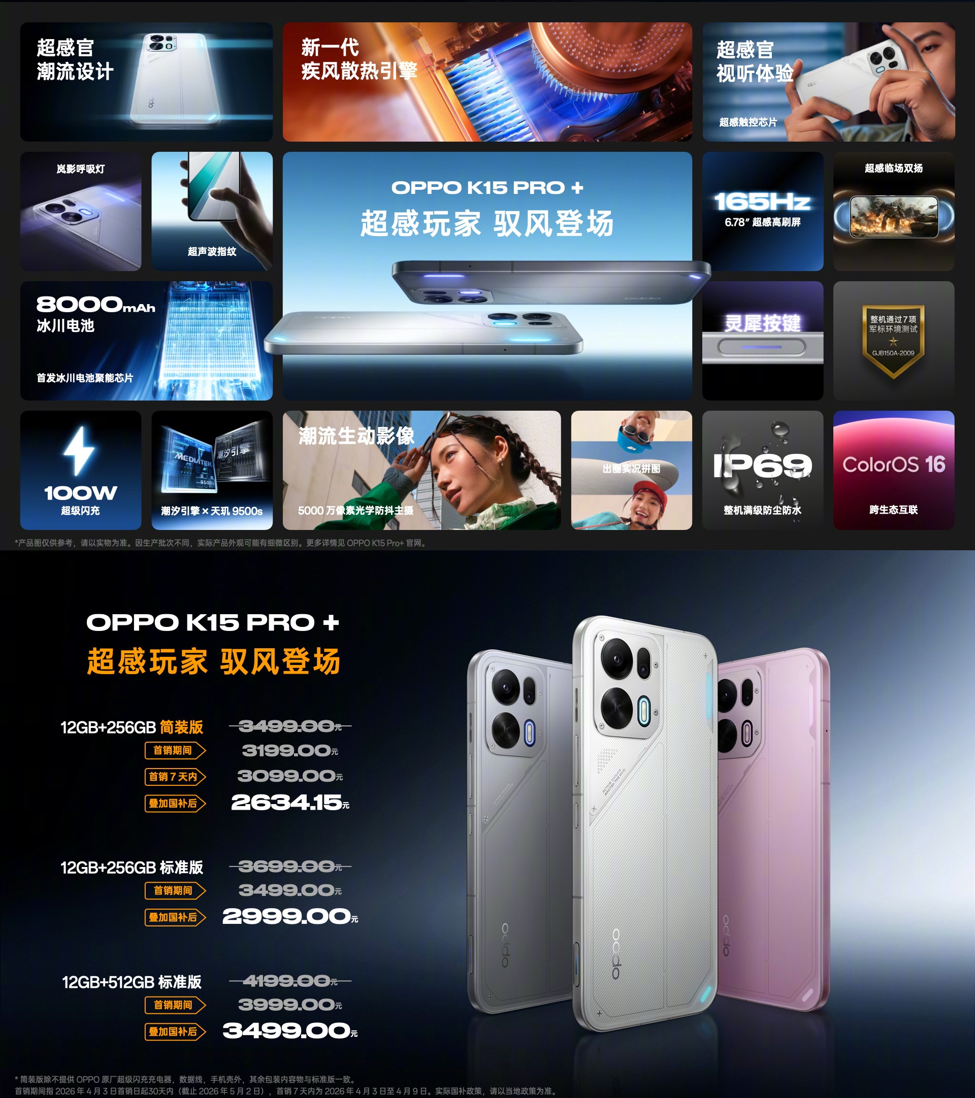 售价方面,OPPO K15 Pro 12GB+256GB简装版定价2999元,首销7天内2899元,叠加国补后2464.15元;OPPO K15 Pro+ 12GB+256GB简装版定价3499元,首销7天内3099元,叠加国补后2634.15元。