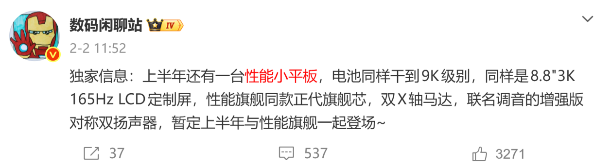 结合该博主此前爆料,该LCD性能小平板或为REDMI K Pad 2,搭载性能旗舰同款正代旗舰处理器,配备8.8英寸3K 165Hz LCD定制屏幕,内置9K级电池,拥有双X轴马达、联名调音的增强版对称双扬。