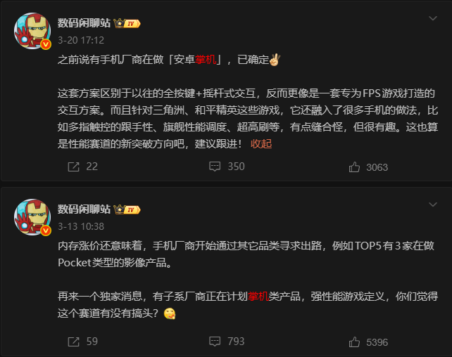 根据此图可了解到,这款掌机还搭载了两颗摄像头,并且配备了闪光灯。且该博主此前也爆料称有一家手机厂商已确定在做安卓掌机,这款掌机的方案区别于以往的全按键+摇杆式交互,是专为FPS游戏打造的一套交互方案。