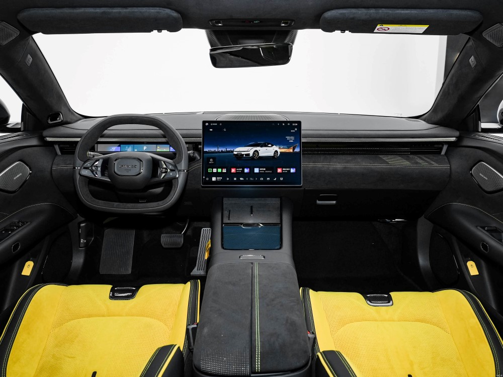 内饰方面,领克10+采用黄黑混搭配色,配备一体式运动座椅,并大量运用翻毛皮材质与碳纤维饰板进行点缀。座舱布局延续现款车型风格,搭载12.3英寸窄长条全液晶仪表盘、HUD抬头显示以及15.4英寸悬浮式多媒体显示屏。