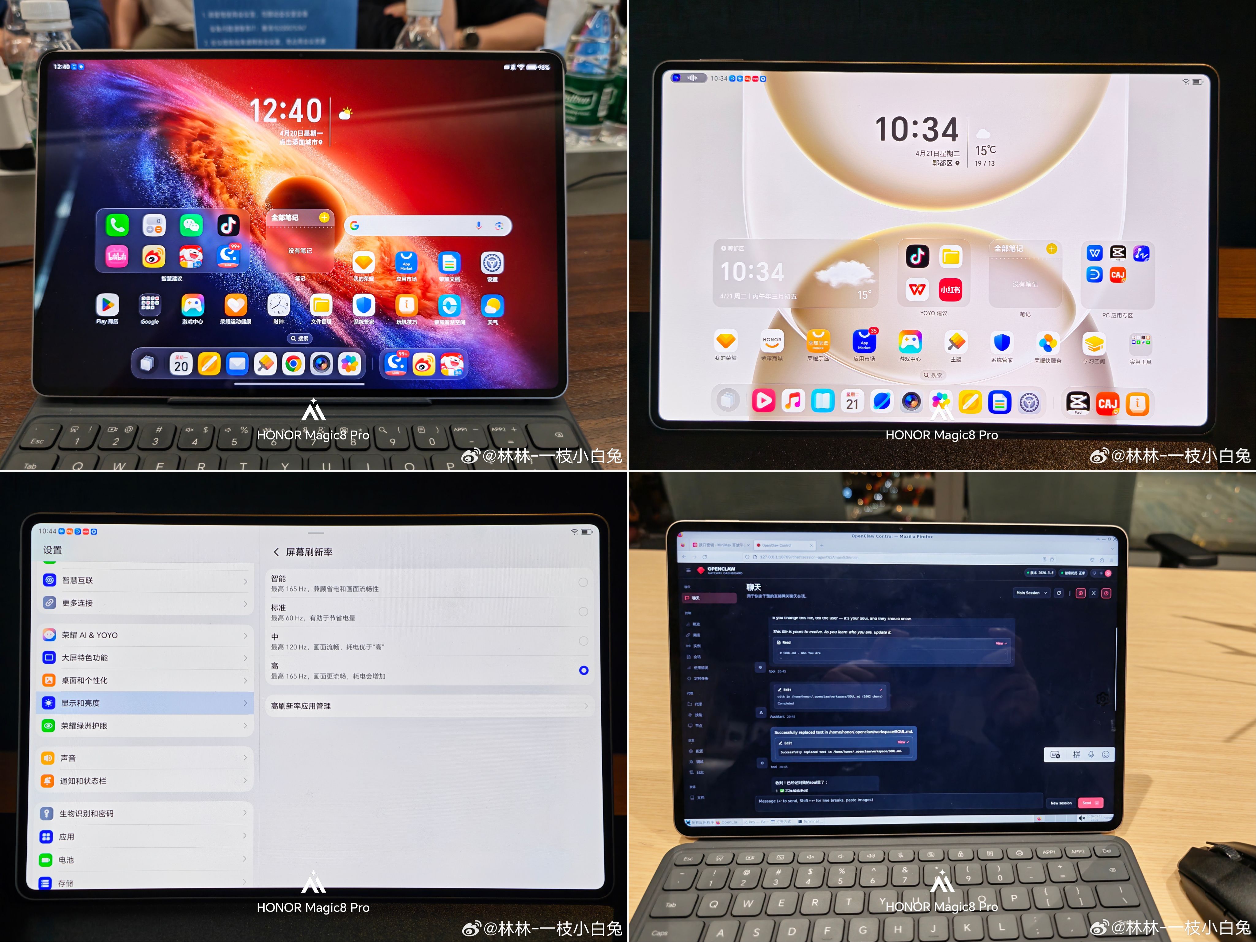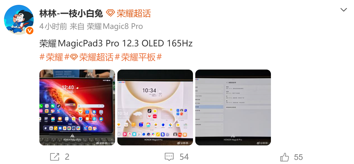 4月21日,荣耀中国区智慧生活业务部部长林林在社交平台上曝光了荣耀MagicPad 3 Pro的真机图片,并爆料其搭载一块12.3英寸165Hz OLED屏。