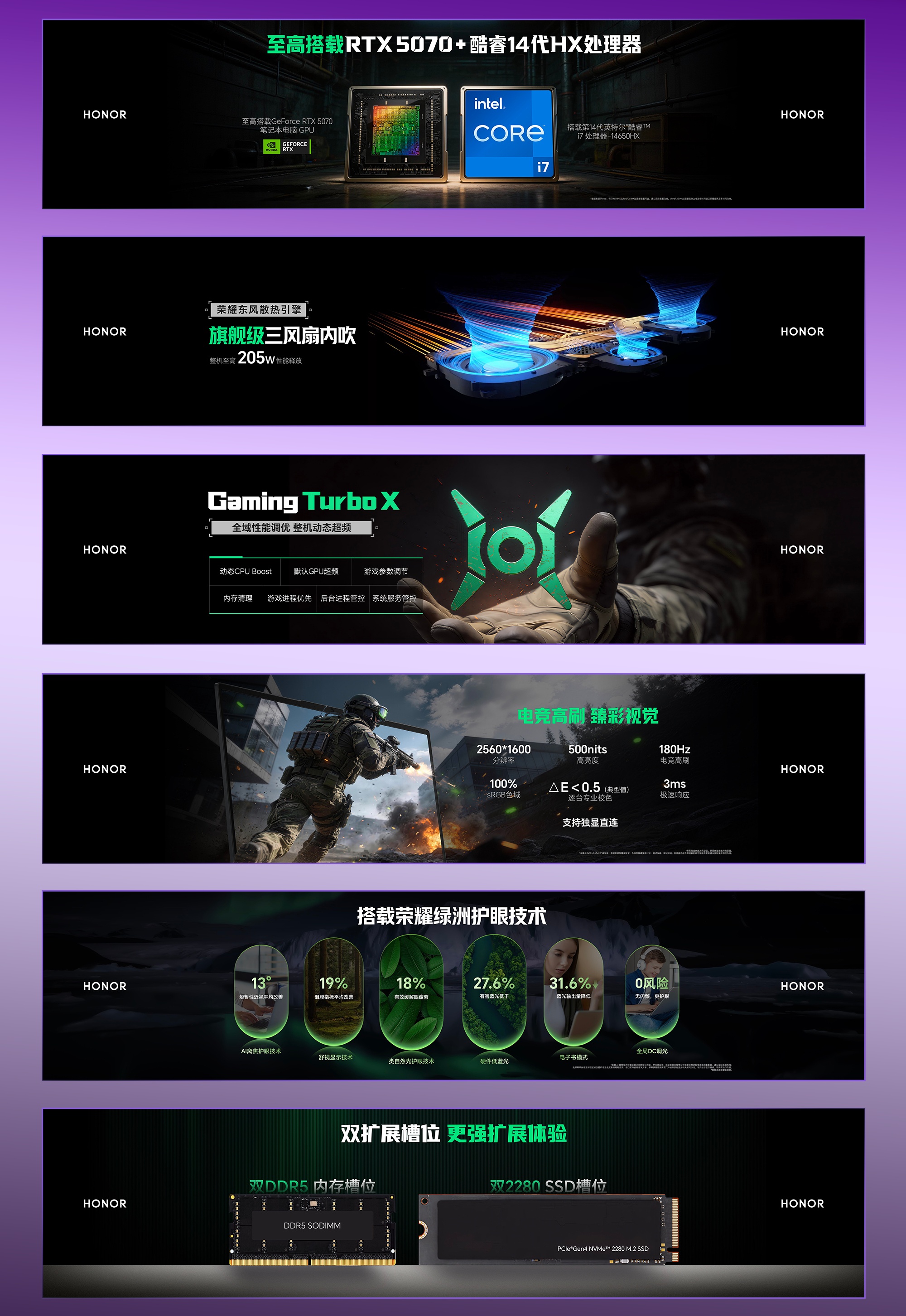 核心配置上,WIN游戏本H7搭载了酷睿14代i7-14650HX处理器,可选配GeForce RTX5060/5070独立显卡,拥有8GB GDDR7显存,搭配荣耀东风散热引擎,具备旗舰级三风扇内吹散热系统,在狂战模式下至高能释放205W峰值性能。这款游戏本内置了80Wh大容量电池,匹配260W适配器,30分钟可充至约70%,还支持100W PD充电,方便用户差旅补电轻装出行。