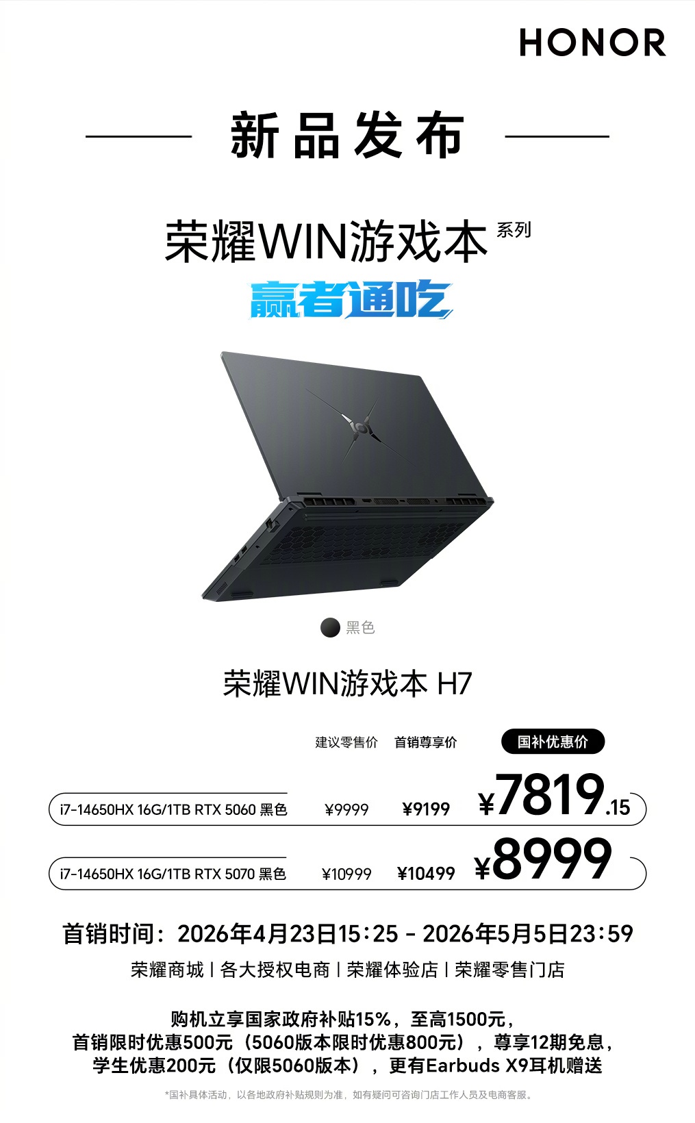 4月23日消息,荣耀正式推出WIN游戏本H7,至高搭载RTX5070显卡+酷睿14代HX处理器。目前这款游戏本已上架荣耀商城,仅提供一款黑色配色,建议零售价9999元起,首销价9199元起。