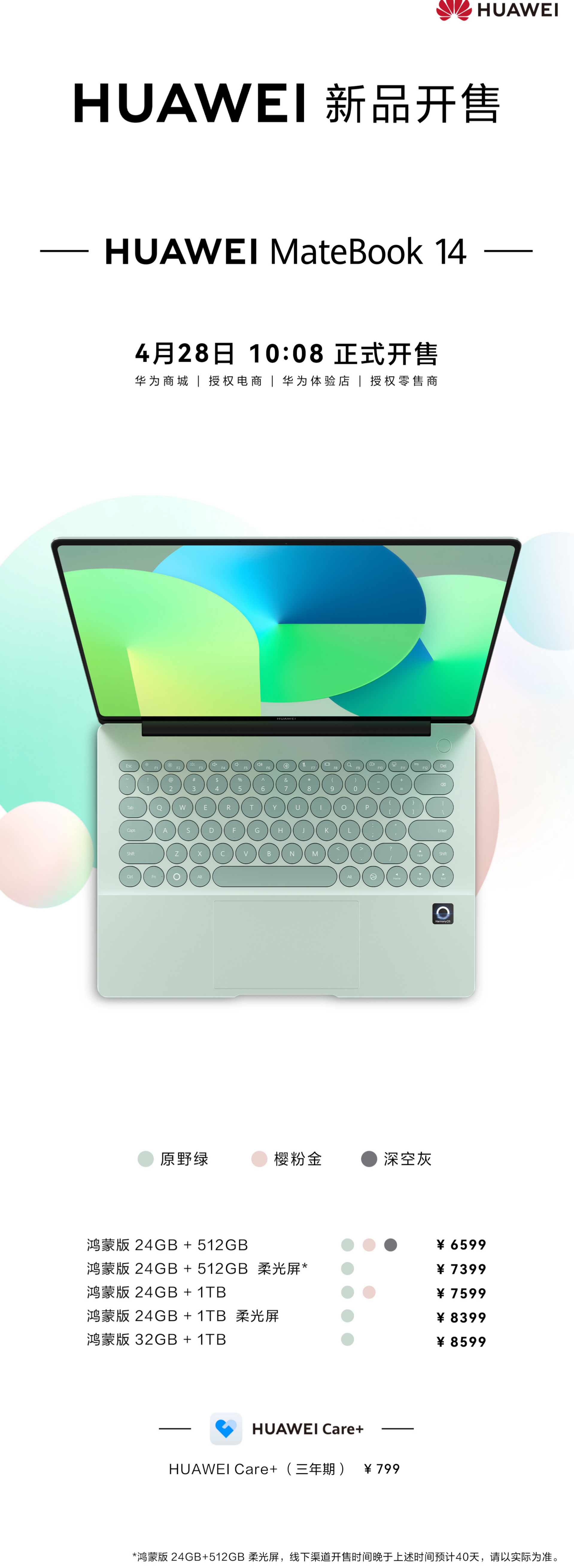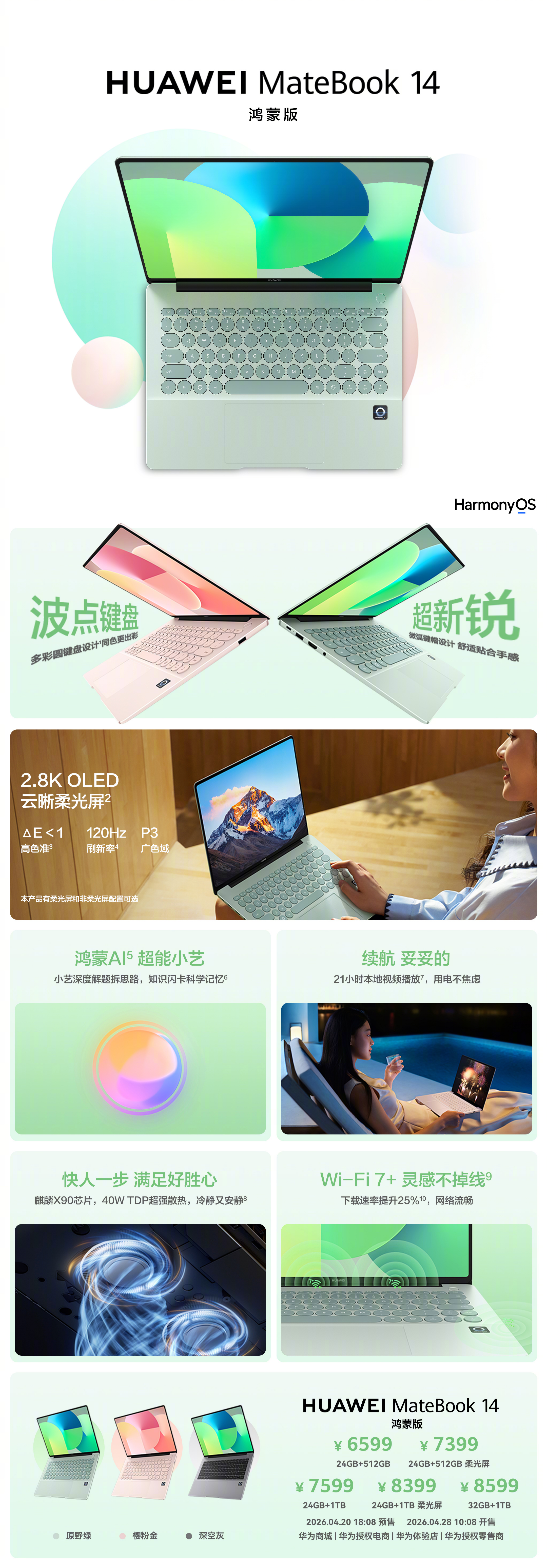 据悉,新品提供原野绿、樱粉金、深空灰三款配色可选,B面配备一块14.2英寸OLED屏,2880×1920分辨率,120Hz刷新率,100% sRGB,支持华为M-Pen 3手写笔;C面采用同色系多彩圆键盘设计。